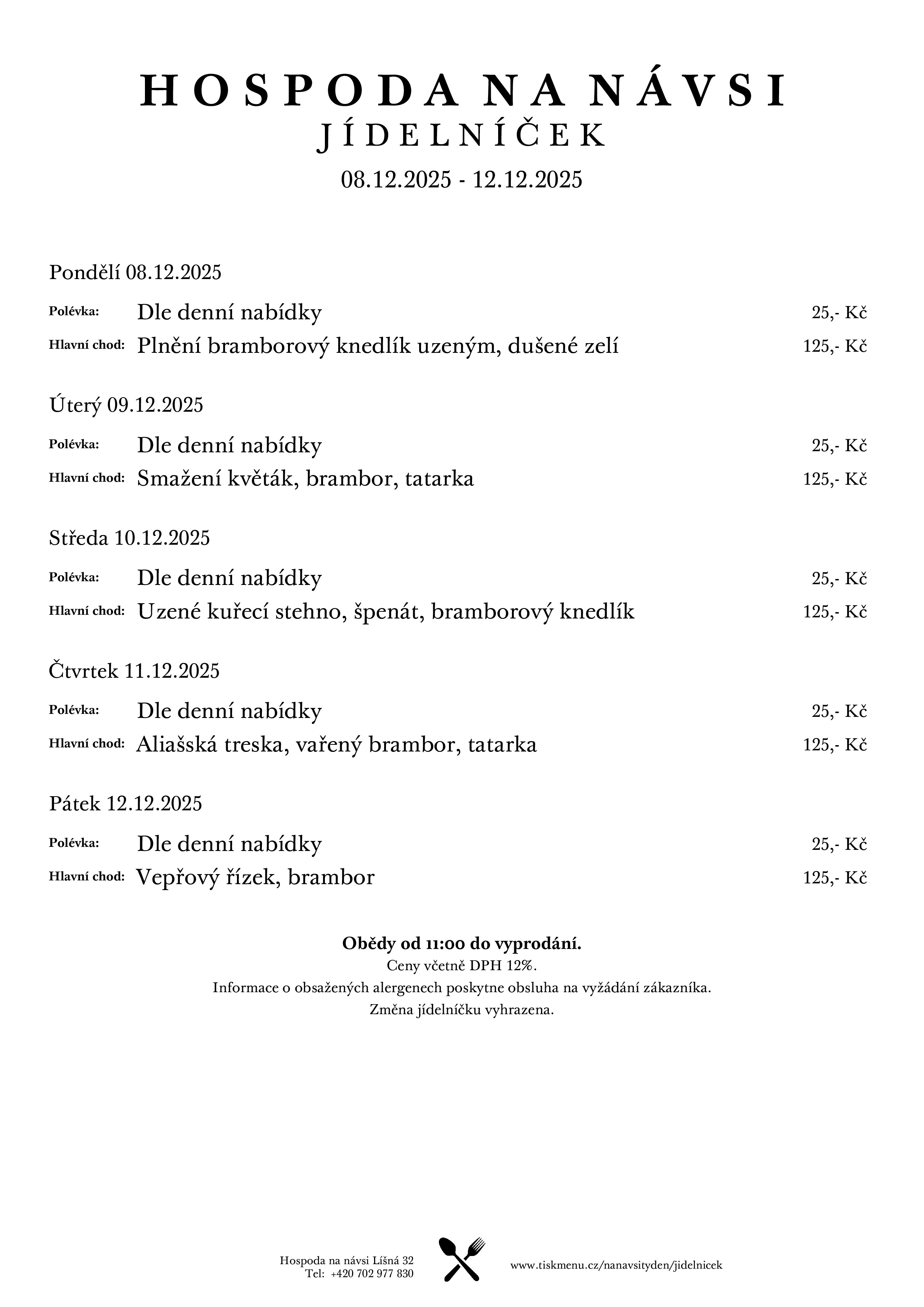 Denní menu podáváme od 11:00 hodin do vyprodání.
